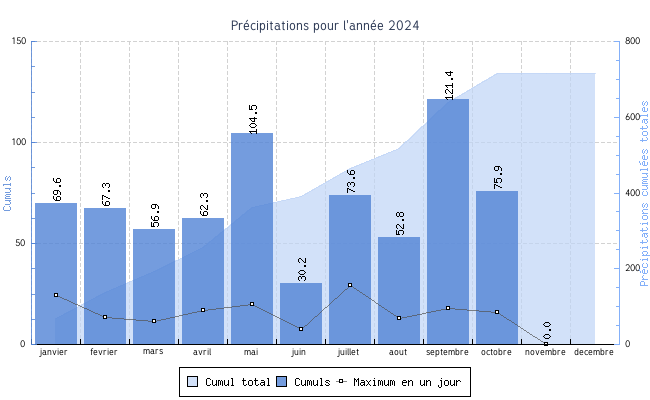 | avril | 0.4 °C | 5.7 °C | 24.7 °C | 16.3 °C | 10.6 °C | 10.3 km/h | 64.0 km/h | SO |