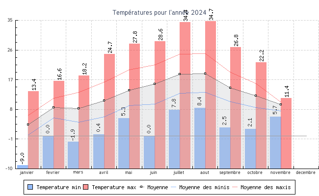 | janvier | -9.0 °C | 0.2 °C | 13.4 °C | 6.2 °C | 3.3 °C | 10.8 km/h | 70.0 km/h | SSO |